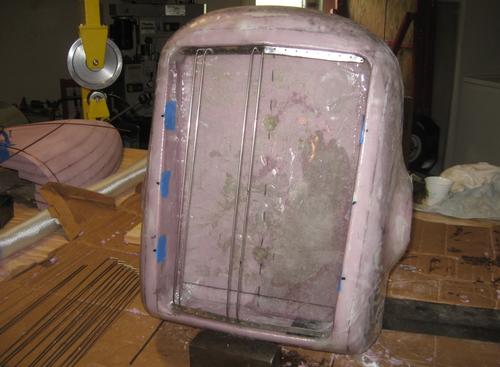 I screwed the parts into the fiberglass shell, and proceeded to start bending and fitting each bar. As I was satisfied with the fit, I epoxied the ends of the bar to hold it in place. When I got all 17 of the full length ones in place, I removed the assembly from the shell. I used electrical tape to form a dam around the ends of the bars, and I filled it in with epoxy resin, forming a solid 3/8 square piece to hold the bars in.