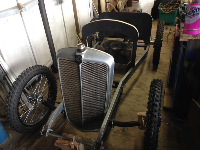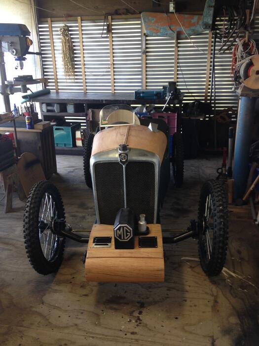 This one started out as two old MG badges and a spare Morrie eight grill I had lying around. Two achieve some resemblance to the original it needed to have the steering wheel on the right side giving the appearance of a two seater.