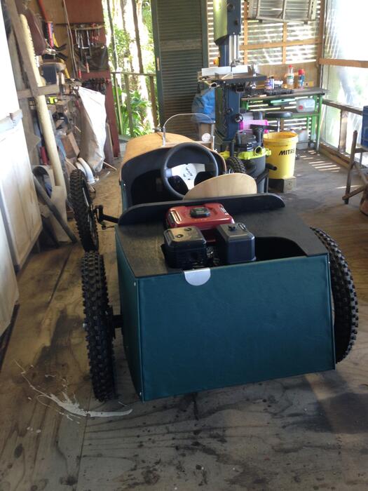 The car has the usual cyclekart details, 6.5 hp motor 17'' wheels mechanical disc brake, rack and pinion steering etc.