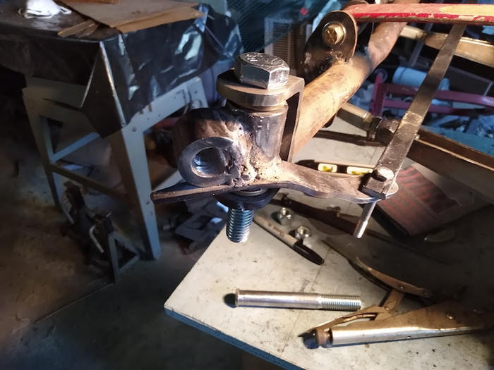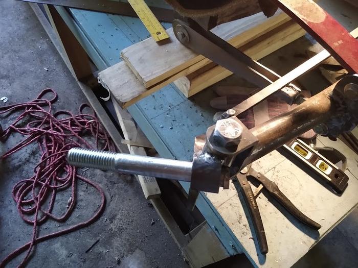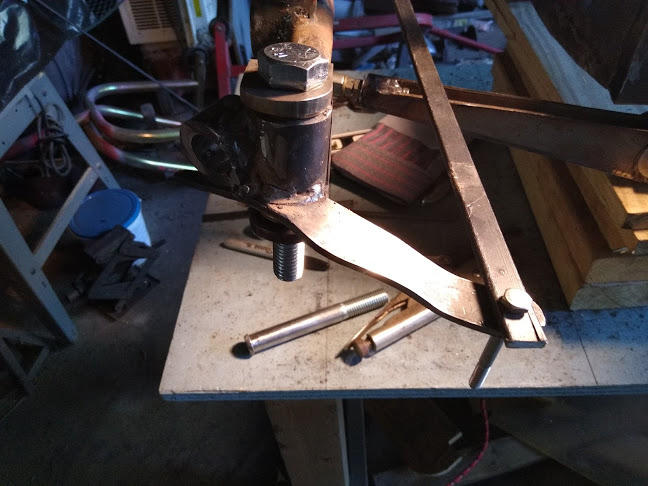 Still working on the spindles. I took a different direction on these from others. I'm hoping this design will help alleviate the stress on the part of the 3/4" bolt at the hex head to shaft junction. The stub axles will interference fit into the spindle ring, and just be tack welded from the rear to keep from overheating the bolt at the weld. We'll see.