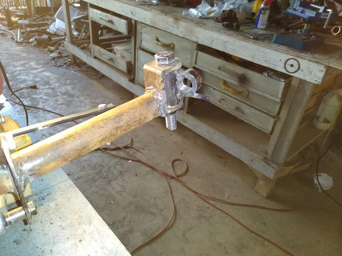 The tie rod you see is just a fiberglass piece to use for figuring out max steering angle. KPI is 8 degree's, and stub axles are welded at 10 degree's to give the desired 2 degree's positive camber. Caster is at 8 also but is adjustable, Pressing on.